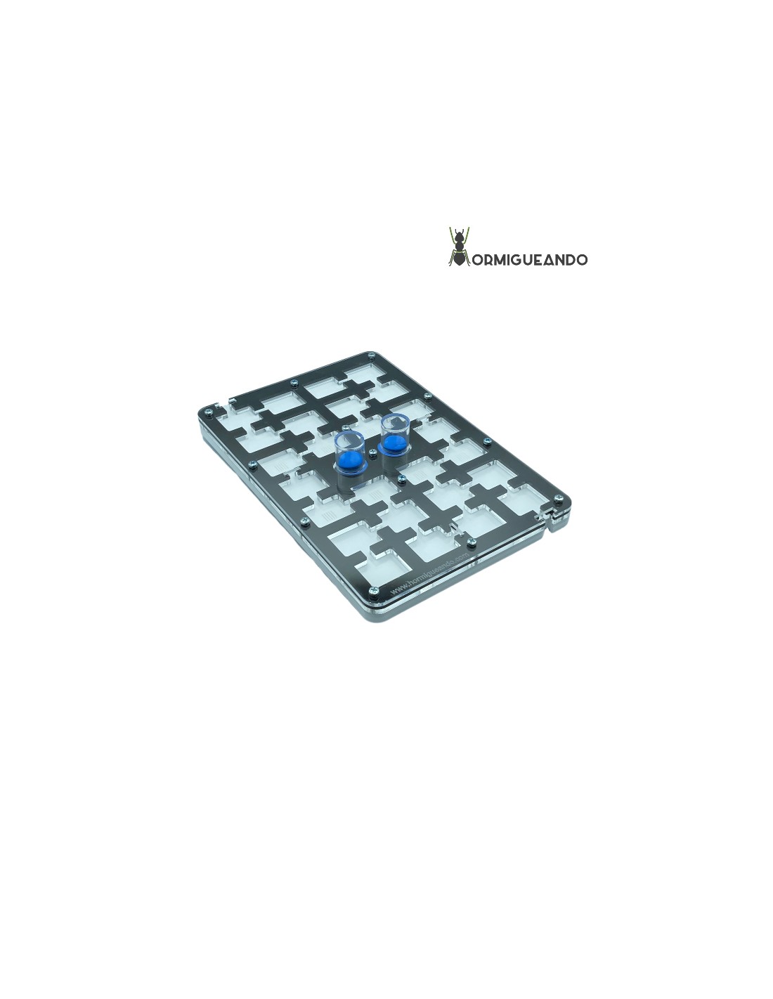 Hormiguero acrílico de 30×20 ampliable con depósito. Tiene zona de forrajeo con tapa de medidas 17x9x7 cm, dos agujeros de conexión exterior para tubos flexibles de 12/10 mm y sistema de humedad con dos depósitos.
