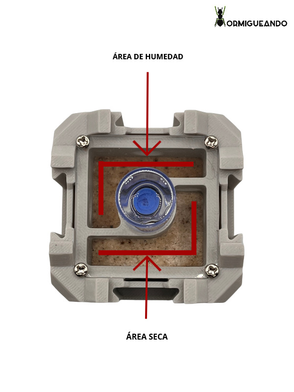 - Gradiente de humedad inteligente: Humedece de forma natural una sección del nido (ideal para cámara de cría o zona húmeda), mientras mantiene la otra sección completamente seca. Esto permite a las hormigas elegir su microclima preferido, imitando perfectamente las condiciones naturales.